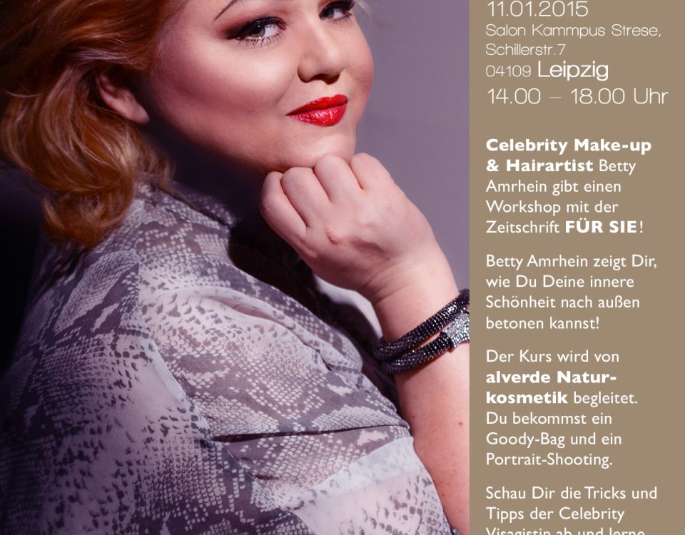 Am 11.1.2015 findet der nächste Make-up Workshop in Leipzig im Salon Kampuss Stress statt. Anmeldungen jetzt unter: betty@bettyamrhein.com Der Workshop beginnt um 14 Uhr und dauert bis 18 Uhr. Zunächst zeigt Betty euch anhand eines Models die Tipps und Tricks für "Natural Beauty". Dann dürft ihr selber üben und am Schluß gibt es ein Portrait-Fotoshooting von euch mit einem Profi-Fotograf und ein Goodybag mit Produkten von Alverde Kosmetik. Ich freu mich auf euch! Preis: 99 Euro