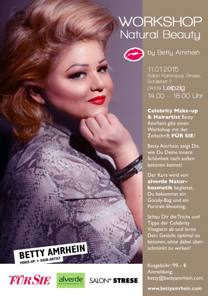 Am 11.1.2015 findet der nächste Make-up Workshop in Leipzig im Salon Kampuss Stress statt. Anmeldungen jetzt unter: betty@bettyamrhein.com Der Workshop beginnt um 14 Uhr und dauert bis 18 Uhr. Zunächst zeigt Betty euch anhand eines Models die Tipps und Tricks für "Natural Beauty". Dann dürft ihr selber üben und am Schluß gibt es ein Portrait-Fotoshooting von euch mit einem Profi-Fotograf und ein Goodybag mit Produkten von Alverde Kosmetik. Ich freu mich auf euch! Preis: 99 Euro